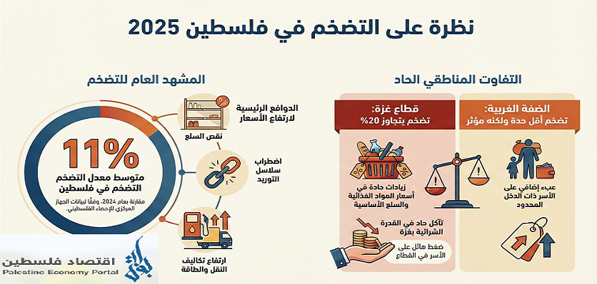 سجّلت فلسطين خلال عام 2025 ارتفاعًا ملحوظًا في مستويات الأسعار، رغم حالة الركود الاقتصادي، وفق بيانات الجهاز المركزي للإحصاء الفلسطيني. وبلغ متوسط معدل التضخم نحو 11% مقارنة بعام 2024، مدفوعًا بنقص السلع، واضطراب سلاسل التوريد، وارتفاع تكاليف النقل والطاقة نتيجة الاحتلال.